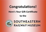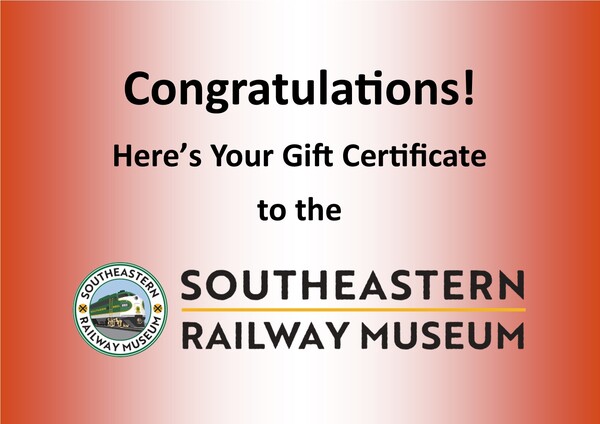 For Our Railfan! A Gift Certificate to celebrate YOU and to enjoy the Southeastern Railway Museum. Congratulations! Select another design $25 $50 $100 $200 $500 Please provide a valid value. Quantity Recipient First Name Recipient Last Name Do not email the gift certificate to the recipient. Recipient Phone Number Recipient email address Confirm Email Address Add another recipient Deliver this Gift Select another design Enter a message for the recipient After clicking continue, you have 10 minutes to complete your order. If your order requires payment, please have your credit card available before continuing. Gift Card Pictures Selected design
